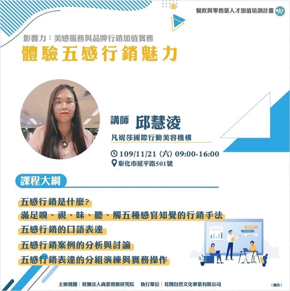 【餐飲與零售業人才加值培訓計畫】 影響力:美感服務與品牌行銷加值實務-體驗五感行銷魅力 發表於29 十一月, 202025 一月, 2021 作者: vanessa811971736 |最新消息|師資介紹|教育訓練|活動花絮|課程花絮|媒體報導 | 凡妮莎國際行動美容機構-邱慧淩 講師於2020/11/21擔任經濟部商業司課程 【影響力:美感服務與品牌行銷加值實務】- 體驗五感行銷魅力經濟部課程講師 課程介紹 一、五感行銷是什麼?二、滿足嗅、視、味、聽、觸五種感官知覺的行銷手法三、五感行銷的口語表達四、五感行銷案例的分析與討論五、五感行銷表達的分組演練與實務操作 #也夢想成為講師嗎?#也想參加下次的課程嗎?歡迎點以下連結追蹤臉書粉絲團 #凡妮莎國際行動美容機構歡迎您 喜歡 正在載入... 相關
