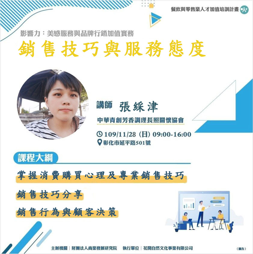 【餐飲與零售業人才加值培訓計畫】 影響力:美感服務與品牌行銷加值實務-零售服務與品牌行銷 發表於29 十一月, 202025 一月, 2021 作者: z0421779 |最新消息|師資介紹|教育訓練|活動花絮|課程花絮|媒體報導 | 中華青創芳香調理長照關懷協會-張綵津 講師於2020/11/28擔任經濟部商業司課程 【影響力:美感服務與品牌行銷加值實務】- 零售服務與品牌行銷經濟部課程講師 課程介紹 一、銷售技巧分享二、分享銷售行為與顧客決策三、話術技巧訓練 #也夢想成為講師嗎?#也想參加下次的課程嗎?歡迎點以下連結追蹤臉書粉絲團 #凡妮莎國際行動美容機構歡迎您 喜歡 正在載入... 相關
